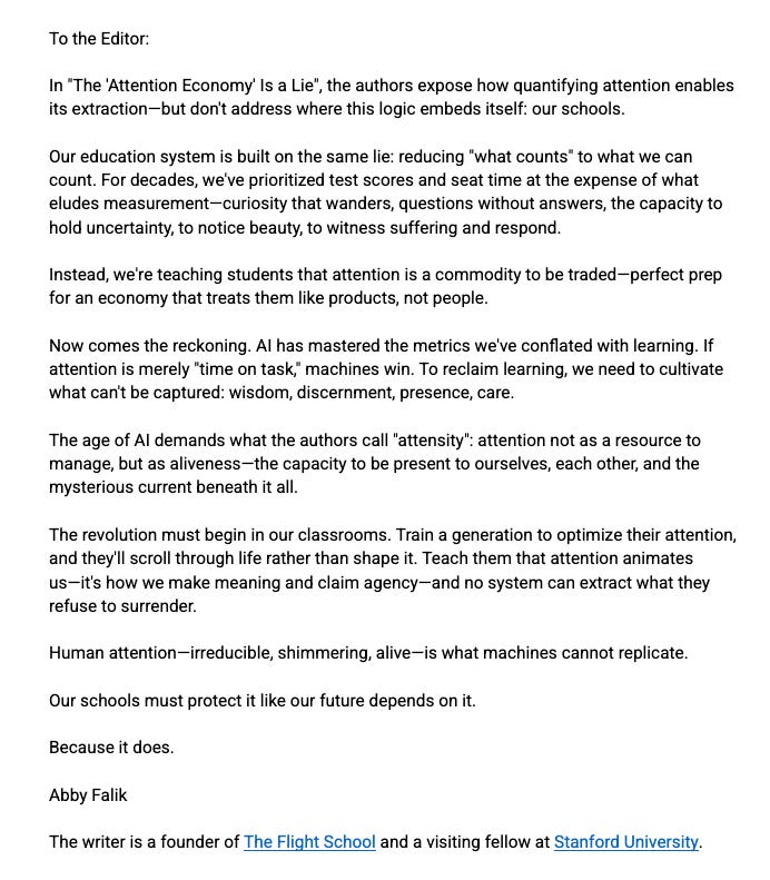 Are we losing our minds? Many of you reached out after my essay on our attention crisis. In that spirit, here’s my recent letter to The New York Times on why the attention revolution must begin in our classrooms. They didn’t publish it, but it feels too important not to share: